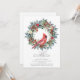 An elegant red cardinal nestled in a winter greenery wreath invites guests to your winter or Christmas birthday party. The watercolor design features a beautiful cardinal and a pine wreath decorated with red flowers and berries along with pine cones.