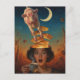 A surreal surprised woman with pancakes popping from her head as she holds her steaming hot coffee cup and a pink cow jumping over them all