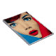 A woman with red hair and vibrant blue eyes covers her face with gloved hands. The background is bright with pop art influences.