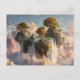 A surreal floating island features cascading waterfalls surrounded by vibrant trees. The sky is filled with fluffy clouds and flocks of birds.