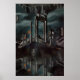 Ancient columns and temple ruins defy gravity in a haunting, impossible world. Massive stone pillars float above a mirror-black obsidian pool, their broken forms reflected perfectly below while inverted cliffs and rock formations hang overhead like a shattered sky. Faint orange embers glow from within cracks, thin light beams pierce the gloom, and a solitary robed figure stands tiny against the overwhelming scale. The scene blends melancholy grandeur, metaphysical mystery, eternal suspension, and quiet awe—perfect for meditation rooms, dark bedrooms, home offices, therapy spaces, gothic-fantasy decor, or as deeply evocative gifts for dreamers, philosophers, fantasy lovers, spiritual seekers, or anyone drawn to surreal symbolism and atmospheric depth.