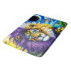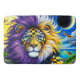 A surreal lion with a flowing mane of purple, gold, and blue hues gazes forward, its face adorned with intricate geometric patterns. The vivid coastal backdrop, glowing sky, and dynamic colour contrasts create a striking fusion of nature and fantasy with a radiant, dreamlike intensity.