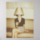 A stylish woman sits poised on a vintage sofa, holding a martini glass while a lampshade humorously conceals her eyes. The warm, nostalgic lighting and retro styling create a cinematic atmosphere filled with mystery and playful sophistication. This striking composition blends surreal humor with mid-century elegance, evoking late-night lounge vibes and timeless glamour.