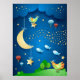 Fantasy landscape by night nwith hanging moon, wave of stars, birds, balloons and flying fishes. Surreal art