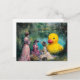 A surreal art style vintage painting of three woman having a picnic with a giant yellow duck at the lake