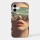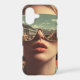 A bold surreal portrait blending retro-futurism with floral elegance. A poised figure wears mirrored visor sunglasses reflecting an immaculate landscape of architecture, mountains, and blooming gardens—blurring the line between inner vision and external reality. Warm vintage tones, symmetrical composition, and lush flowers create a sense of curated perfection, optimism, and quiet power. This artwork feels both nostalgic and forward-looking, making it a striking statement piece for lovers of surreal portraits, futuristic aesthetics, and imaginative visual worlds.