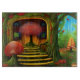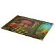 Glass cutting board features AI generated surreal digital art painting of a tree growing within a carved out tree with stairs in a magical forest.