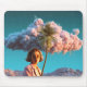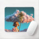Woman with short blonde hair and round glasses, wearing a pink blazer and smoking a cigarette. She stands next to a tall palm tree. Behind her is a large, fluffy cloud with pink and grey hues against a teal sky. The ground appears to be a rocky, mountainous terrain. The overall mood is surreal and dreamlike.