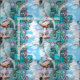 A 5th dimension reality seen through an opening dream portal were paradise meets a surreal teal-blue landscape with the S Dali clock and a woman painting the sky. the water running off the clock with the metal dolphin bound only by our imagination with a focus on lush plants, colourful flowers, or animals found in tropical climates.