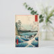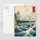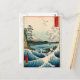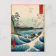 Vintage Japanese print by Andō Hiroshige shows a view of Mount Fuji from Satta Point in the Suruga Bay, with breaking waves in the foreground.