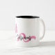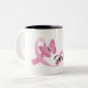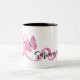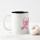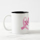 This coffee mug is shown in a breast cancer survivor pink ribbon print.