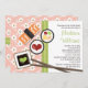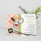 Are you throwing a Japanese themed bridal shower? The bride and her guests are sure to love these cute and pretty sushi bridal shower invitations with a pink and white cherry blossom and green kimono inspired background and a pair of crossed chopsticks, plate of soy sauce and heart shaped wasabi, and three pieces of sushi (heart shaped tuna roll, salmon nigiri and a veggie roll). Artwork © Chrissy H. Studios, LLC. All Rights Reserved.