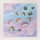 An adorable and imaginative design featuring a variety of happy, smiling sushi characters soaring through a dreamy pastel-colored sky filled with fluffy clouds and ringed planets. It's a perfect blend of Japanese cuisine cuteness and cosmic fantasy.
