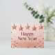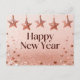 The text "Happy New Year" is rendered in rich, deep brown or maroon lettering for beautiful contrast. Hanging above are five perfectly detailed, rose gold star ornaments, adding dimension and festive flair.