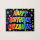 This fun and exciting birthday-themed jigsaw puzzle design has the message "HAPPY BIRTHDAY, SUZANNE" with the characters having a colourful rainbow spectrum inspired gradient pattern, along with a lively star field background pattern. An exciting puzzle like this might be a fun way to send birthday greetings to somebody named Suzanne. [~Z0000468]
