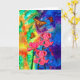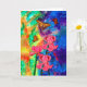 Print of my original water colour painting on a Greeting Card featuring a colourful abstract sky with two swallowtail butterflies and a monarch butterfly fluttering around pink iris flowers.