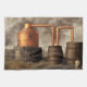 A copper pot still churns away in a misty swamp. Dark smoke billows from the furnace while moonshine trickles into a jug from the worm. It looks like the moonshiner has run off though. Once should never leave a still alone when distilling. Actually, this would not be a particularly practical still. Firstly, it would be easy to spot from the air (perhaps that's why the boot legger has fled). Furthermore, it would be pretty labour intensive as the moonshiner would have to constantly dump buckets of cool water into the condenser. Traditionally, a moonshine still would be located downhill from a cool water source, so that it could be piped into the condenser. Plus it would be hidden in some mountain forest to help hide the shiner's activity from the law.
