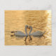 A nature photograph of a swan couple on a lake swimming to meet each other at sunset. Their necks are forming a heart shape against the golden reflections in the water.
