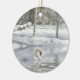 A beautiful winter scene of a elegant swan swimming with snow on the banks. A very pretty winter ornament.