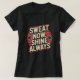 A vintage-style circular badge with a sunset gradient backdrop and the motivational phrase "Sweat Now, Shine Always." This design encourages putting in the hard work today to enjoy the rewards forever.