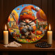 This charming clock features a festive autumn scene with a large, smiling gnome sweeping a pile of fallen leaves. He is wearing a red and orange striped hat and a cosy orange sweater. The gnome is surrounded by pumpkins and squirrels gathering acorns. In the background, there's a cosy yellow house and a sign that reads "SWEATER WEATHER". The clock face is set against a background of autumn colours, all framed within a circular border.