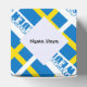 The Swedish flag, blue with a yellow Nordic Cross, and the word SWEDEN below, in blue with snow capped letters. Design is tiled for artistic effect. A white area of squiggly squares has a place for your name for a personalised touch. If you want to create a customised gift, just add someone else's name.