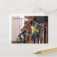 Swedish flags fly from storefronts along a quaint street in Stockholm's Old City.