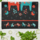 This kitchen towel has a Swedish folk dala horse design with matching folk art flowers in Sweden's flag colours of teal and red on black background. At the top and bottom are a row of matching smaller dala animals and flowers. You can make the background pattern on this kitchen towel smaller or larger.