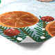 A hygge scene unfurls, presenting a festive Jultomten adorned in a green knit cap, a cosy red sweater, and tiny brown boots, savouring a steaming bowl of porridge on a snowy day. Delightful clusters of dried oranges, pine, and berries form a vibrant border. Original illustration by Noël Snow