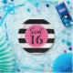 Sweet 16 birthday party plates in pink black and white stripes pattern.