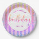 “Happy 16th birthday”. Here’s an unique addition to her birthday fête! Use this stunning, modern, tiny sparkly turquoise blue faux glitter confetti dots and yellow pink orange purple ombre typography script against a light pink and rainbow ombre glitter striped background, paper plate for an event to remember. Personalise the custom text with your guest of honour’s name. Your choice of 2 sizes: 7” or 9”. Guaranteed to add stylish fun to her special party! Matching and coordinating invitations, napkins and other birthday goodies are also available in this trendy and special collection.