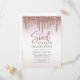 Modern and elegant sweet 16 birthday party invitation you can easily customise with your party details. Featuring glitter drips with rose gold gradient background and script typography.