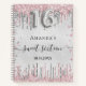 Modern, stylish and glamourous for a girl's Sweet 16, 16th birthday party. A faux silver looking background, decorated with pink and faux silver glitter dust. Personalise and a name and a date. Number 16 is written with a balloon style font, script.