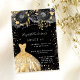 A modern, stylish and glamourous invitation for a Sweet 16, 16th birthday party. A black background with faux gold glitter dust, a dress and black and gold roses, florals. The name is written with a modern hand lettered style script. Personalise and add your party details.