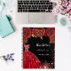 A stylish black background decorated with red flowers, sparkles and a red dress. Personalise and add name, age and date.