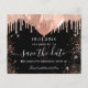 A black background decorated with rose gold, blush faux glitter drips, sparkles, and balloons. Personalise and add a date and name/age. The text: Save the Date is written with a large trendy hand lettered style script.