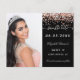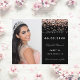 On front: Add a vertical size photo. A black background colour, decorated with rose gold faux glitter dust. Personalise and add a name and details.