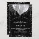 A stylish black background. Decorated with faux silver glitter and balloons. Personalise and add a name, age and party details. The name is written with a hand lettered style script