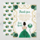 This sweet sixteen birthday thank you card features an elegant gold frame, a beautiful princess with brown hair and a emerald green dress, flowers and a balloon.