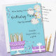Sweet Sixteen birthday party invitation with cute retro style pedestal cake, 16 candles, sparkly confetti and balloon details in lavender, black and gold colours on aqua blue background. Coordinating candle accents on the back. Edit all your details on both front and back in the easy "personalise it" text editor.