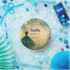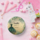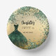 For a Sweet 16, 16th birthday party. A faux gold looking background with green confetti, a dress and green confetti. The name is written with a modern hand lettered style script. Personalise and add your name and a date.