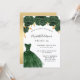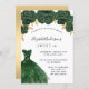 A modern, stylish and glamourous invitation for a Sweet 16, 16th birthday party. On the front: A white background with an emerald green dress and green roses, florals. The name is written with a modern hand lettered style script. Personalise and add your party details.