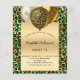 For an elegant Sweet 16, 16th birthday. An emerald green and gold leopard, cheetah pattern background. A golden frame and balloons. Personalise and add a name, age and party details. The name is written with a hand lettered style script