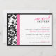 This modern sweet 16 invitation features black and white damask, a black border and a bold stripe of colour. Add your information using the template form. Use the "Customise" feature to change the font, layout and colours.