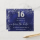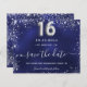 A girly and trendy Save the Date card for a Sweet 16, 16th birthday party. A navy blue uneven coloured background. Decorated with faux silver glitter, sparkles. The text: Save the Date is written with a large trendy hand lettered style script. Number 16 is written with a balloon style font.
