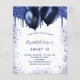 A girly and feminine birthday party invitation. On front: A white background. Decorated with navy blue faux glitter drips, paint dripping look and balloons. Personalise and add a name and party details. The name is written with a hand lettered style script.