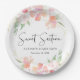 Elegant and pretty sweet 16 birthday party paper plates featuring delicate watercolor bouquets of pink and coral florals with gold accents and "Sweet Sixteen" in a stylish airy script. Personalise with her name and the party date.