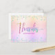 Here’s a fun, sparkly way for the birthday girl to show her appreciation to all who supported her milestone event! Send out this stunning, simple, festive, modern, personalised thank you postcard. Rainbow glitter script typography, along with festive turquoise, purple pink and gold confetti, overlays a rainbow ombre foil metallic background. On the front, personalise with her name. Type a custom note on the back, or leave blank for your handwritten message. Also add your return address. Great for the budding fashionista who loves modern glitter and glam and guaranteed to add a stylish touch to her correspondence!