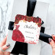 For a Sweet 16, 16th birthday party. A white background with red confetti, a dress and red roses, florals. The name is written with a modern hand lettered style script. Personalise and add your name and a date.