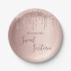 A paper plate for a girly and glamourous Sweet 16th birthday party. A faux rose gold background with drips. The text: Sweet Sixteen is written in dark rose gold with a large modern hand lettered style script. Tempate for a name.